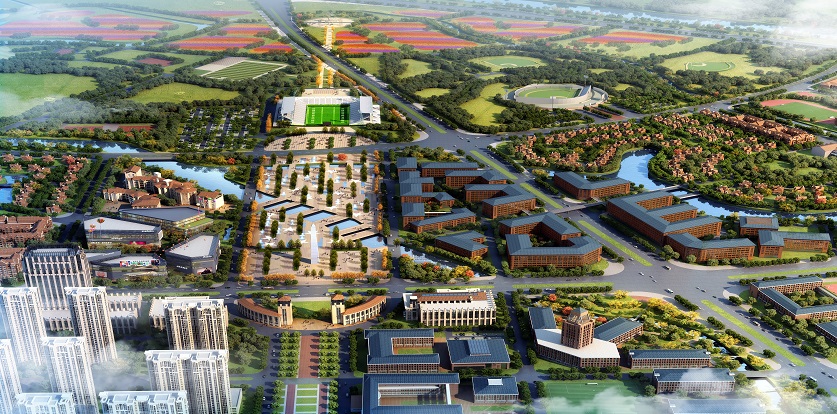 四片區(qū):教學(xué)區(qū)、城鎮(zhèn)區(qū)、運(yùn)動(dòng)公園區(qū)、生態(tài)濕地區(qū)